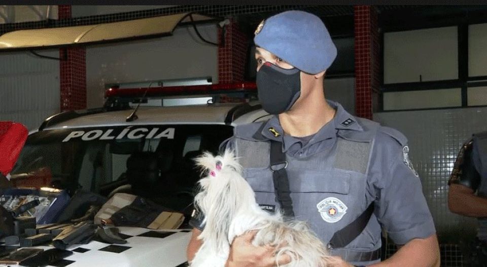 Os donos do animal, da raça yorkshire, foram detidos e deverão responder pelo crime de porte ilegal de arma. O homem e a mulher foram abordados pela PM na Avenida dos Bandeirantes, em Moema, na Zona Sul de São Paulo. Eles estavam dentro de um carro roubado, que chamou a atenção dos agentes.