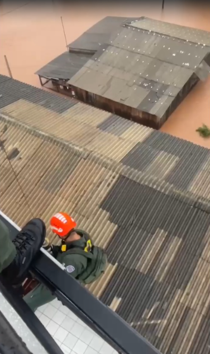 Nesta quinta-feira (2), a equipe do Águia 12 resgatou uma família ilhada no telhado de uma residência em São Sebastião do Caí. Das seis pessoas salvas, três eram crianças. Todos foram encaminhados ao ponto de apoio do governo local.