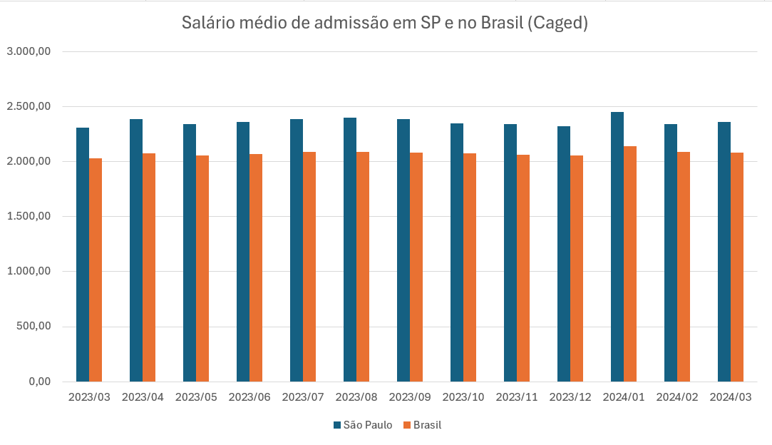 Segundo o Caged, o salário médio de admissão em março foi de R$ 2.361,24, enquanto no Brasil ficou em R$ 2.081,50. O estado de São Paulo teve ainda o maior salário maior de admissão entre todas as Unidades da Federação. O aumento foi de 0,84% em relação a fevereiro.