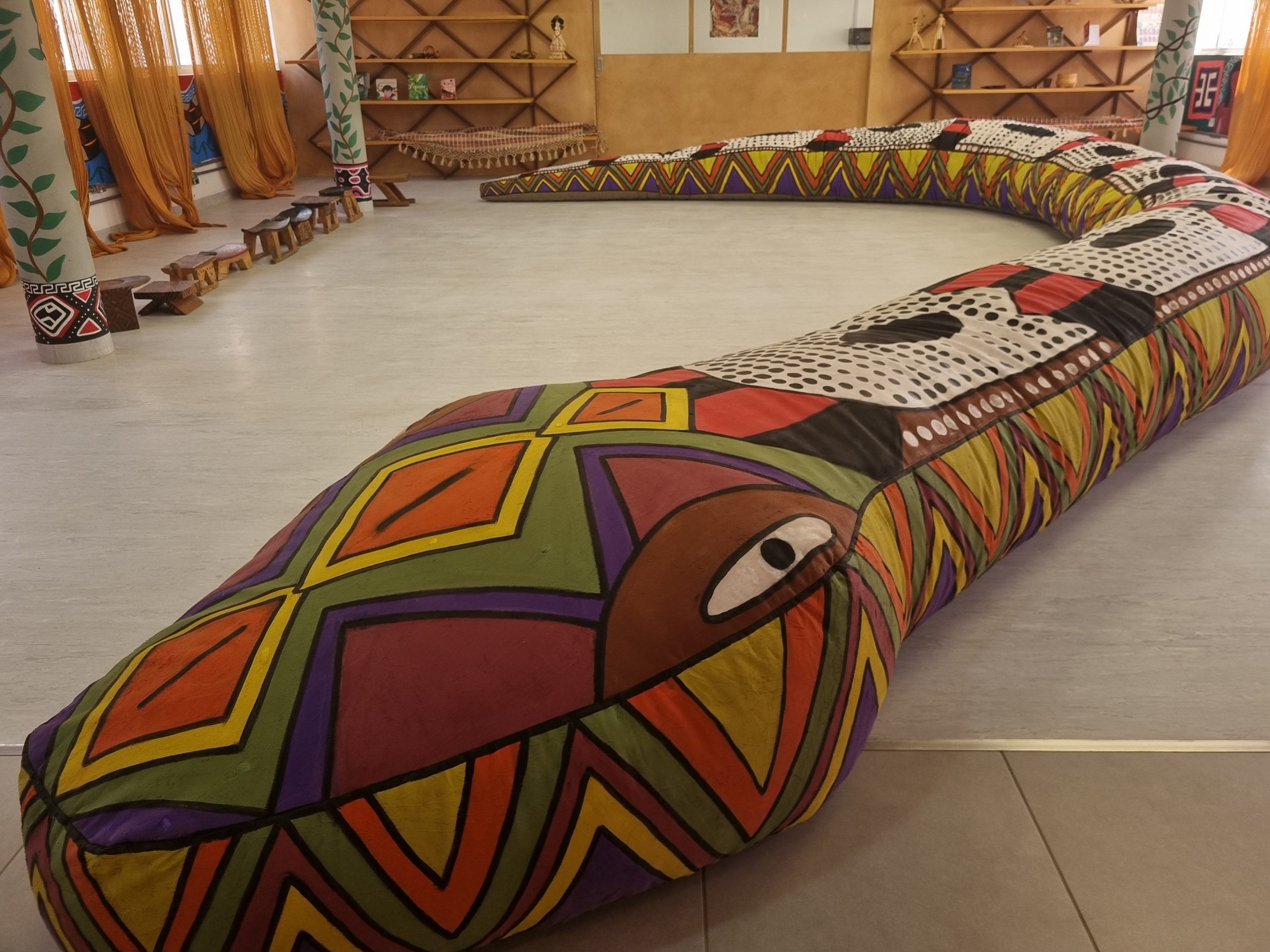 O grande pufe em formato de jiboia é uma criação da artista Rita Huni Kuin, que se inspirou na relação mitológica do caçador Yube Inu e da mulher-jiboia Yube Shanu.