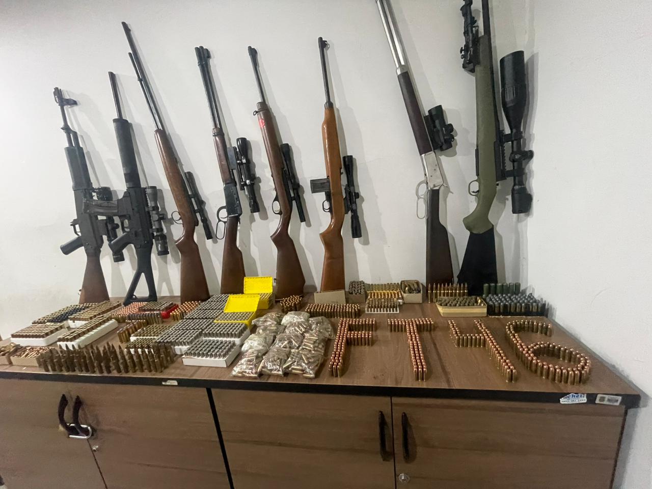 Para deter o suspeito, os policiais precisaram subir pelo telhado para entrar no imóvel. Durante as buscas, além das armas, munições e drogas, os agentes encontraram mais de R$ 2 mil em espécie, quatro cartões de crédito, oito relógios, quatro celulares e documentos em nome de um homem e uma mulher, que agora são investigados.