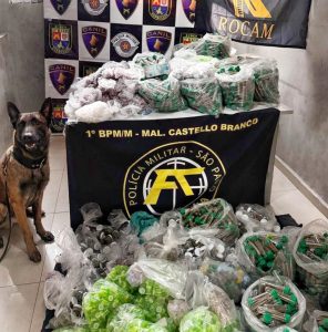 Com apoio do Canil do 5º Batalhão de Ações Especiais de Polícia (Baep), os agentes encontraram um imóvel desabitado, na comunidade Campo do Bandeirante, que funcionava como “casa bomba”. Lá foram apreendidos 7,3 quilos de lança perfume, 190 gramas de crack, 2,2 quilos de maconha, 695 gramas de cocaína e cinco comprimidos de ecstasy, que totalizaram 10,4 kg de drogas. Além de uma pistola 9mm e 28 munições intactas.