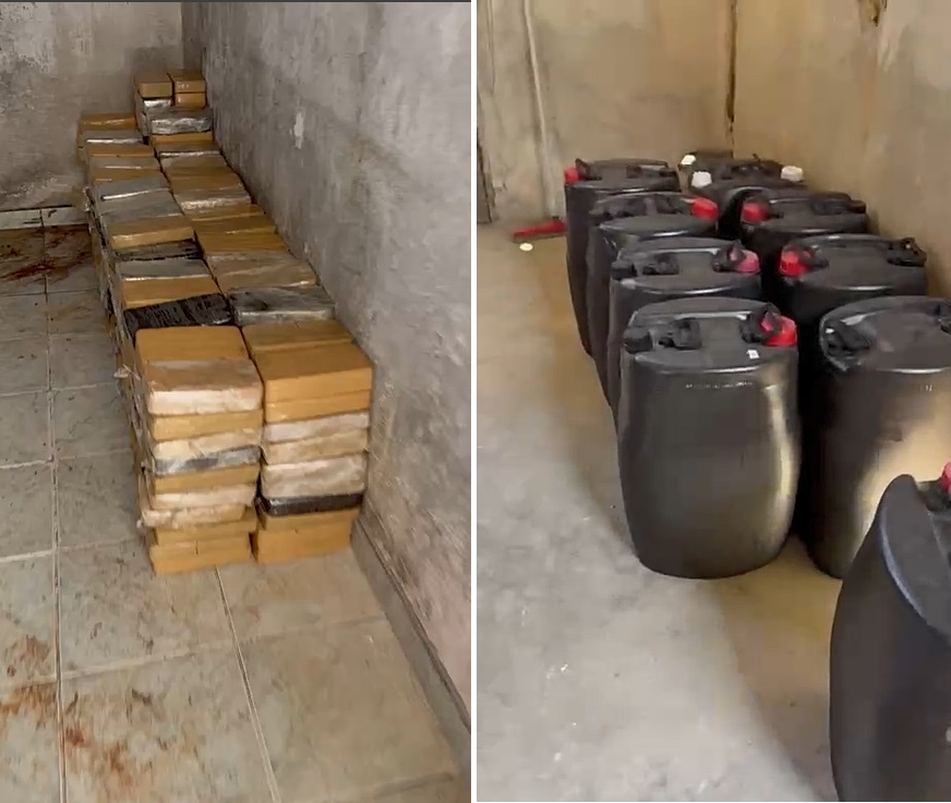 Na parte de cima da casa, diversos galões contendo líquidos, possivelmente usados no refino da cocaína, foram apreendidos. Em uma sala ao lado, havia 350 tijolos de pasta base. Parte do entorpecente também estava guardada em sacos plásticos.