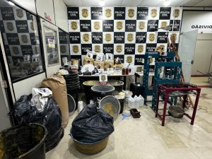 Além disso, foram recolhidos um fogão, duas prensas, duas balanças de precisão, oito liquidificadores, três peneiras, um tambor, uma panela, nove baldes, uma bacia, vários moldes plásticos, fitas adesivas e maquinários e apetrechos utilizados no processamento das drogas.