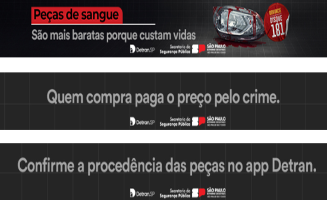 O Departamento Estadual de Trânsito de São Paulo (Detran-SP) em parceria com a Secretaria de Segurança Pública (SSP) lança mais uma campanha de conscientização popular por um trânsito mais seguro e para a preservação de vidas. A partir do conceito “Quem compra peças ilegais paga o preço pelo crime”, a iniciativa quer sensibilizar e educar a sociedade sobre os riscos do comércio ilegal das chamadas “peças de sangue”, obtidas a partir do roubo e furto de veículos.