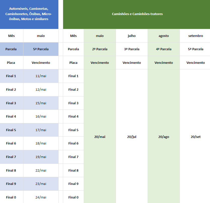 Os caminhões têm prazos diferenciados e a segunda parcela deve ser recolhida até 20 de maio – o calendário completo pode ser conferido abaixo.